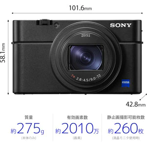 - フルサイズミラーレス一眼「α9」と同等の高速・AF性能を持つコンパクトカメラ。メモリー一体1.0型積層型CMOSイメージセンサー「Exmor RS」を搭載。